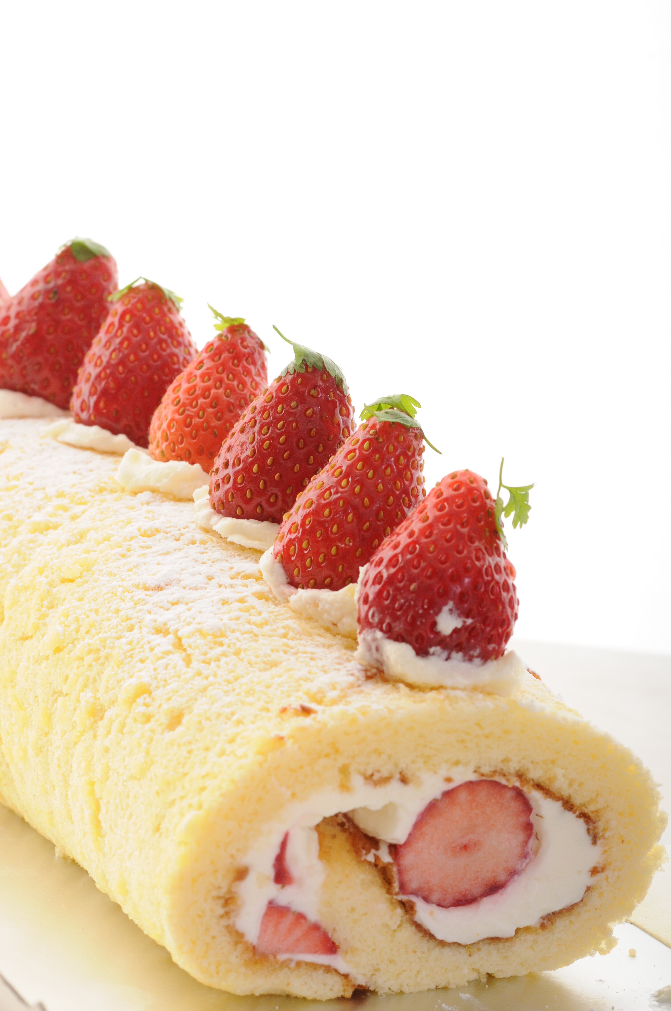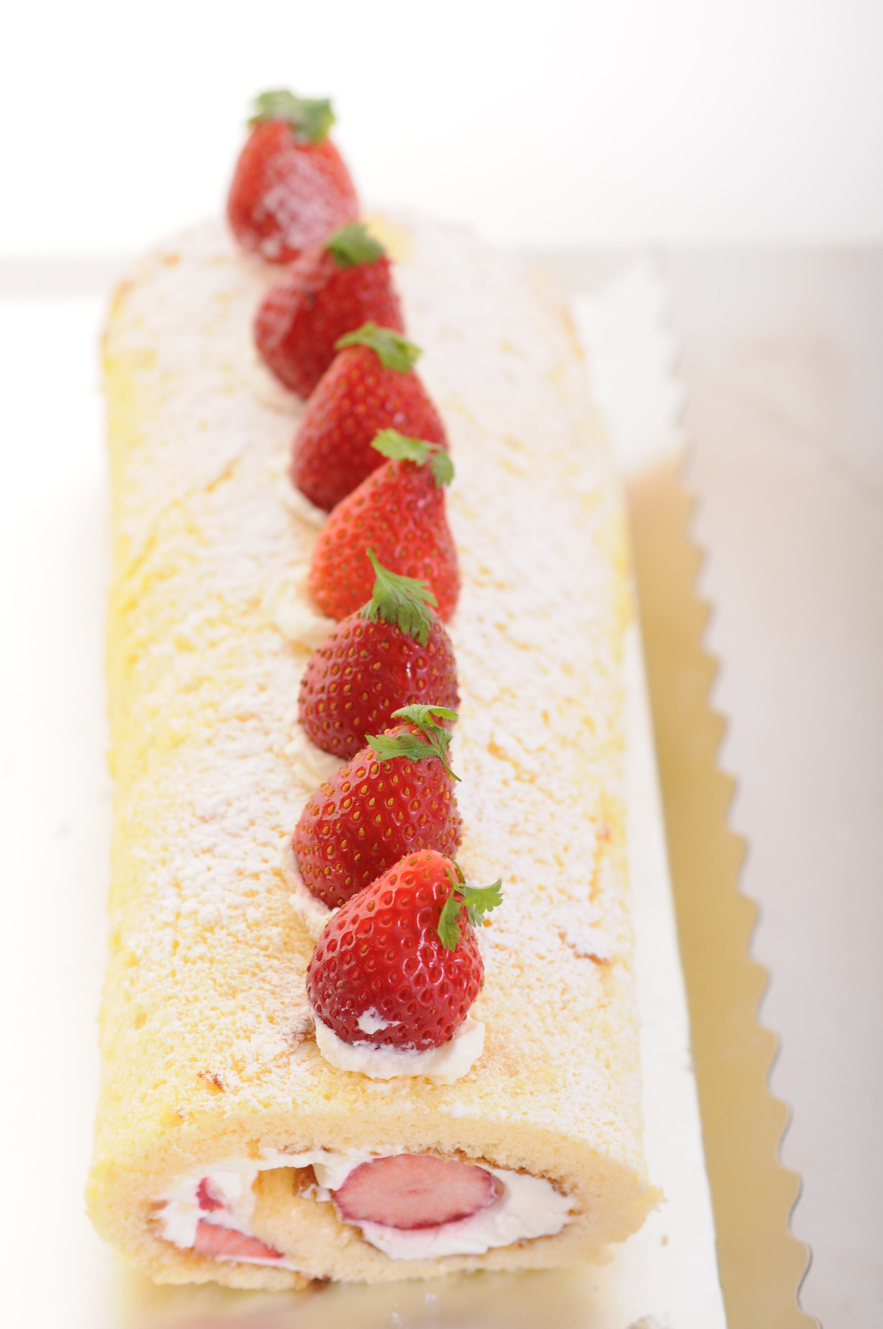 いちごのロールケーキです。はちみつたっぷりのふわふわスポンジに丸々のいちごをふんだんに使って作りました。